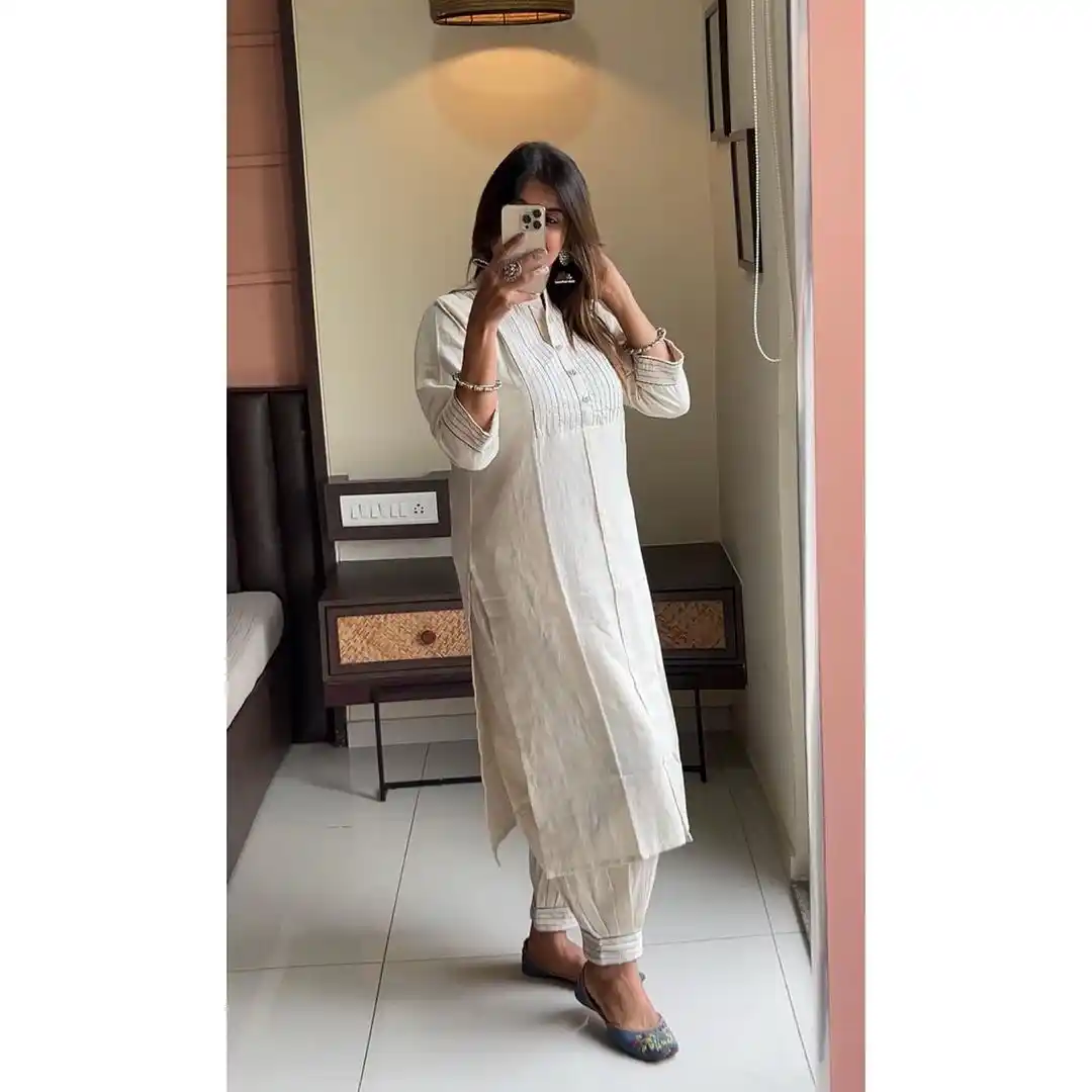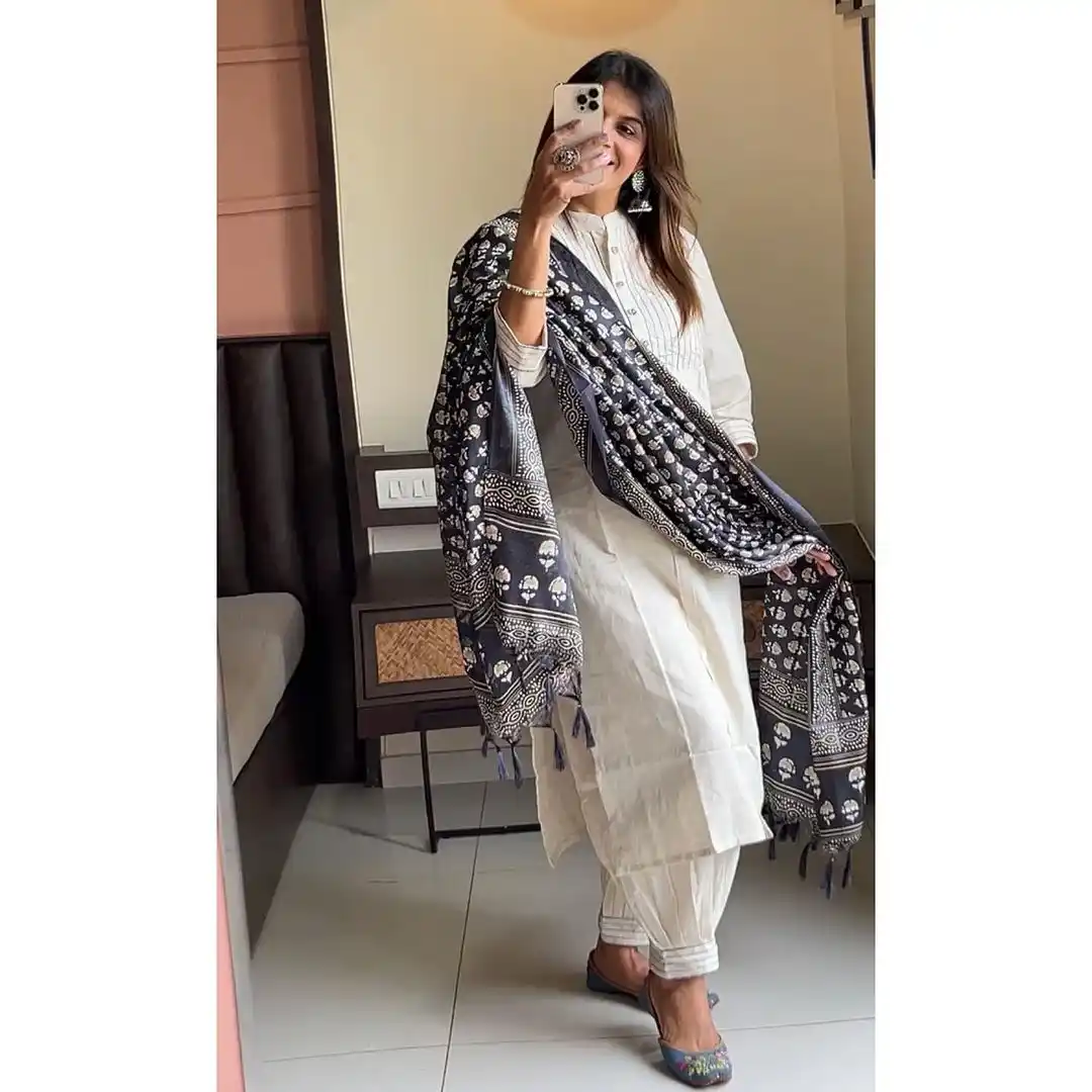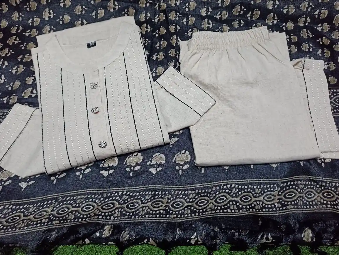 Cream Khadi Cotton Kurti Set With Dupatta For Women